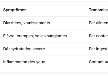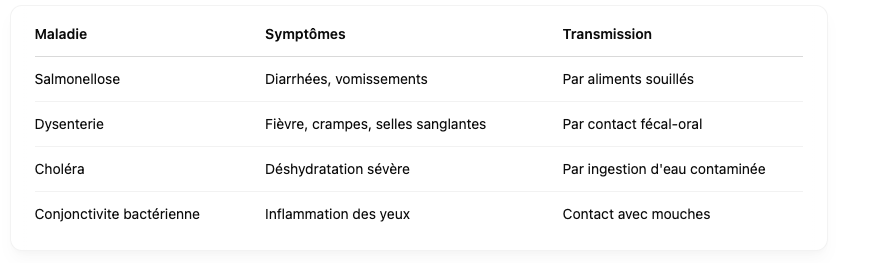 Les mouches, attirées par les odeurs fortes et la nourriture, se déplacent entre ordures, excréments et aliments, transportant ainsi :